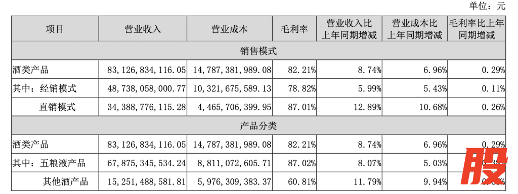 分模式来看,经销模式实现营收487.38亿元,同比增长近6%,毛利率为78.82%,同比提升0.11个百分点;直销模式实现营收343.89亿元,占比近四成,同比增长12.89%,毛利率为87.01%,同比增长0.26个百分点。五粮液经销商数量增长82家至2652家,五粮浓香经销商数量同比增加245至1059家。
